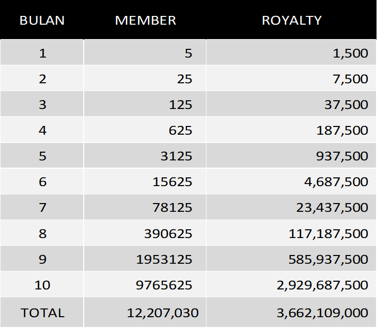 Berikut ini potensi royalti pengembangan yang akan anda terima dengan asumsi duplikasi sebanyak 5 member dalam 1 bulan
